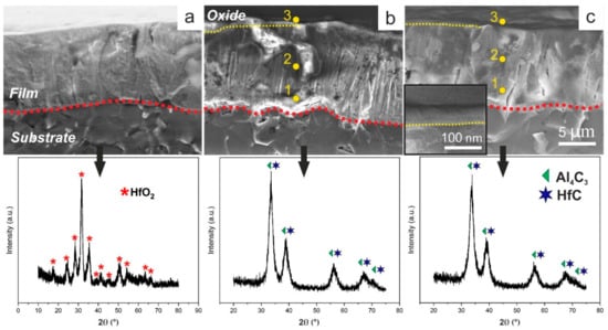 As can be seen in Figure 4a, after annealing for 140 min at 800 °C, the HfC film completely transforms into monoclinic HfO2 (P21/c), JCPDS 43-1017 standard). Besides, one can detect a clearly visible film structure change after the annealing test. Despite the fact that X-rays were carried out in the grazing beam mode, no changes in the phase composition of the coatings were recorded for both Hf–Al–C systems. As can be seen from Figure 4b,c, XRD patterns of Hf–Al–C films completely match with XRD patterns of the same coatings before annealing. No displacements of the peak centers, as well as their broadening, can be found. This fact supports the suggestion that the formation of the protective amorphous Al2O3 on the top of Hf–Al–C film protects it from further oxidation. While X-ray diffraction analysis did not show any changes in the Hf–Al–C coatings after the annealing test, the SEM micrographs of both films showed the formation of a thin surface layer with a dense homogeneous structure without pronounced crystallinity, different from that of the reference HfC coating (inset of Figure 4c, the part above the yellow dotted line). The thickness of this layer is ~70 nm irrespective of the Al concentration in Hf–Al–C films. In order to determine the composition of the surface layer formed in Hf–Al–C systems, an EDX analysis was performed. It was found that near the substrate-coating interface, as well as in the central part of the coating, oxygen is completely absent (Figure 4b,c, yellow dots 1,2). The elemental composition of the Hf–Al–C film (IAl = 1 A) at these points is the same and amounted to 49.5 at.% C, 44.9 at.% Hf and 5.5 at.% Al. Elemental composition of the Hf–Al–C film (IAl = 2 A) at the same points was 47.7 at.% C, 43.2 at.% Hf and 9.1 at.% Al. EDX analysis of the surface layer of both Hf–Al–C coatings (Figure 4b,c, point 3) showed the presence of the oxygen content in the amount of 22.77 and 18.62 at.%, for Hf–Al–C (IAl = 1 A) and Hf–Al–C (IAl = 2 A) films, respectively.