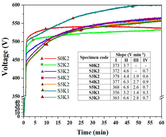 As shown in Figure 1, increasing KOH from 1 to 3 g L−1 (S3K1, S3K2, and S3K3 graphs) decreases the breakdown voltage and significantly extends stage IV at expense of stages II and III. Furthermore, in the presence of 3 g L−1 KOH, the duration of stage IV is longer than that of 2 g L−1 KOH (S3K2 specimen).