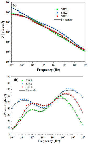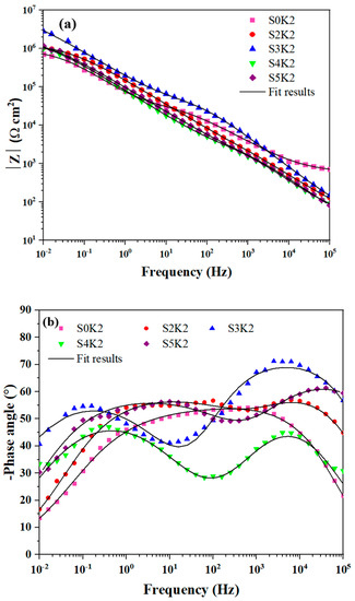 The S3K2 specimen exhibited two humps at high and low frequencies, however, S2K2, S4K2, and S5K2 show a capacitive loop at high frequencies and another at the middle to low frequencies. The high-frequency hump is related to the outer layer and another is raised by the inner layer. The shift of the low-frequency hump to the higher angles indicates that the inner layer of S3K2 has a higher corrosion resistance than other coatings. In the high-frequency region, shifting the hump toward high frequencies and decreasing the value of reflect the decrease of coating corrosion performance owing to more defects on the coating surface [56,57]. As seen before, the outer layer of S3K2 is denser than other coatings, therefore, it has a higher at the high-frequency region.