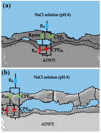 Based on EIS results, an equivalent electrical circuit (EC) can be offered. Different circuits are proposed due to the difference in the shape of EIS plots of the coatings, Figure 8a.