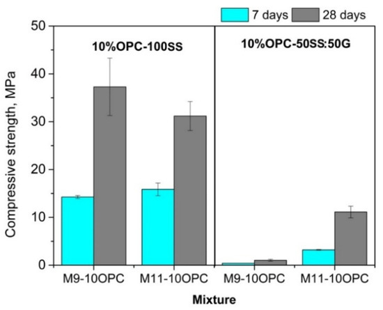 To evaluate glass (G) as a precursor in M9 and M11, 50 wt.% SS was replaced by G and, in turn, the OPC content was lowered to 10 wt.% to further reduce the carbon footprint of the mixtures. For these pastes, it was necessary to adjust the L/S ratio to 0.36 in order to obtain a paste with adequate workability that could be mixed and emptied into the molds. The results for the compressive strength of the hybrid pastes M9 and M11 with a replacement of 50% SS by G are shown in Figure 4. It was found that the replacement of SS by G reduced the compressive strength of the pastes at the ages of 7 and 28 days of curing. The loss of strength at age 28 days reached 97% for M9 and 73.57% for M11 with the replacement of SS by G. This behavior is attributed to the fact that the incorporation of G as a substitute for SS initially provides less amorphous SiO2 compared to SS [60]. The authors of [69] suggest that the optimal conditions for obtaining SS from glass waste involve 6 h of agitation at a temperature of 85 °C to achieve a solution comparable to commercial SS. In this investigation, glass was added directly to an alkaline solution of NaOH [9.6 M], allowed to stand for 20 min, and was subsequently emptied and mixed with the CW + OPC solids, so that the glass was dissolved to obtain SiO2 reagent similar to SS; this is an extra reaction that must occur before starting the alkaline activation process and providing the percentage of Na2O and SiO2 of the design [72]. Due to the process conditions used in this research (25 °C and short mixing time), the kinetics of the geopolymerization reaction when using G are affected by its low dissolution, and consequently the formation of N-CASH and CSH gels is reduced.