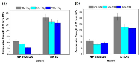 Compressive strength for pastes with incorporation of (a) TiO2 and (b) ZnO particles.