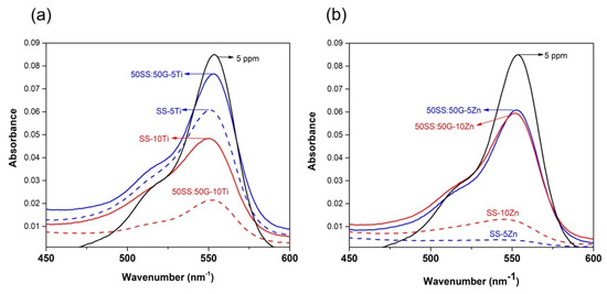 UV−VIS spectrum for different mixtures after 24 h of exposure to RhB with incorporations of (a) TiO2 and (b) ZnO particles.