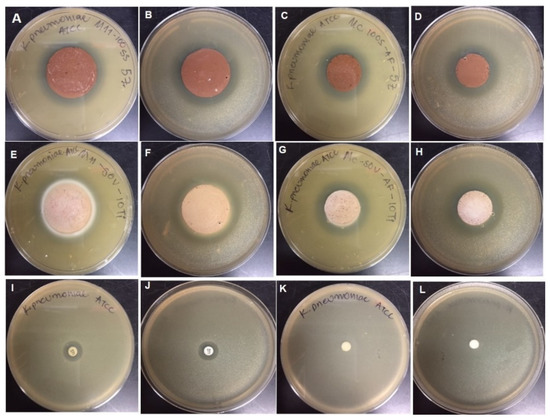 Images corresponding to the agar of K. pneumonia for different mixtures and the control. Front and rear views are presented, respectively. (A,B) paste 100SS-5Z, (C,D) mortar 100SS-AF-5Z-G, (E,F) paste 50SS:50G-10Ti, (G,H) mortar 50SS:50G-AF-10Ti-G, (I,J) Sensi-disc control of gentamicin, and (K,L) Sensi-disc control with no inhibition.