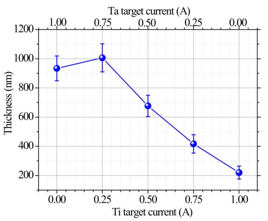 Figure 1 presents the thickness of the deposited films as a function of the Ti and Ta targets’ applied currents. The trend coincides to that of the deposition rate, since the deposition period was set to 3600 s for each batch.