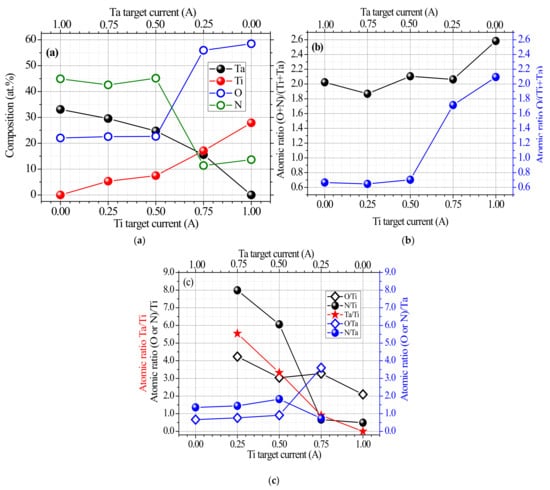 Chemical composition (a) and atomic ratios (b) and (c), as a function of Ti and Ta target applied currents.