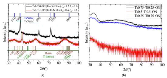 Figure 3a,b presents grazing incidence XRD patterns of the deposited oxynitride films. According to these results, due to the presence of characteristic diffraction peaks, the single metal element oxynitrides (Ta1–Ti0–ON and Ta0–Ti1–ON, Figure 3a) exhibit a certain degree of crystallinity. On the other hand, all the other co-sputtered samples (TaTiON, Figure 3b) showed an amorphous structure, regardless of the deposition parameters.