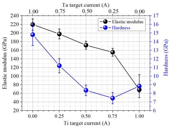The variation of the indentation hardness and elastic modulus as a function of Ti and Ta target applied currents.