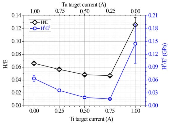 The variation of the H/E and H3/E2 ratios (H/E—elastic strain to failure ratio, H3/E2—indicator of a material’s resistance against plastic deformation) as a function of Ti and Ta target currents.