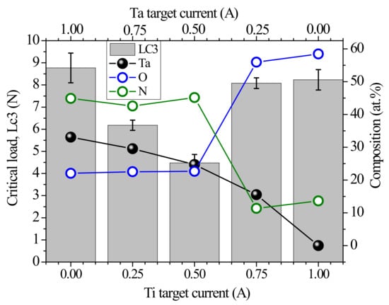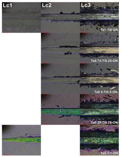 It is worth mentioning that not all critical loads were observed on each sample. The amorphous samples did not exhibit the formation of any cracks for the selected interval of loads applied on the indenter, most probably due to their amorphous character and relatively low H/E ratio values. Once the current applied on the Ta target is gradually decreased, both the load which causes the first delamination (Lc1) and the one necessary for film removal (Lc3) decrease. However, the samples with the highest oxygen content (Ta0–Ti1–ON) and the lowest nitrogen content (Ta0.25–Ti0.75–ON), both produced with  A and  A, delaminate entirely due to increasingly higher loads.