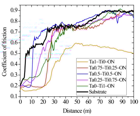 The wear behaviour was assessed on a rotational tribometer, against Al2O3 balls. From the variation of the friction coefficient as a function of distance, shown in Figure 9, the following observation can be made: all samples, with the exception of the bare substrate, exhibit a low friction regime, from up to ~30 m for sample Ta1–Ti0–ON, down to ~10 m for sample Ta0.5–Ti0.5–ON, followed by a high friction regime, which would signify that the substrate was breached by the Al2O3 ball. The better wear behaviour of sample Ta1–Ti0–ON could be linked to its higher hardness. Interestingly, even if sample Ta0–Ti1–ON has the lowest thickness, it behaves adequately during wear tests, exhibiting a low friction regime for a larger duration relative to the other samples.