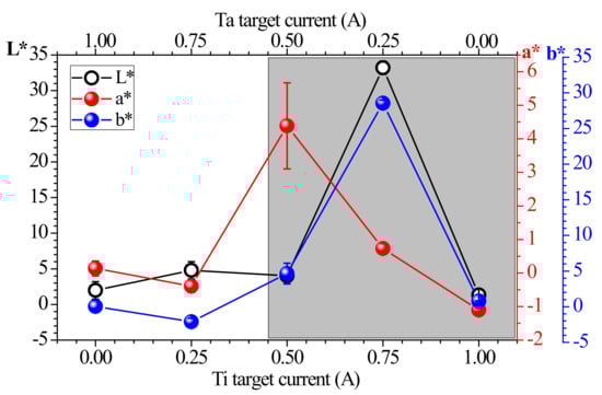 Since the perceived colour of a material depends on the illuminant, a proper comparison was made using the CIE L*a*b* colour coordinates system. The variation of the L*, a*, and b* coordinates from the CIE L*a*b* colour space, as a function of the deposition parameters, is shown in Figure 11. The colour parameters of the two films produced with highest Ta target current (Ta1–Ti0–ON and Ta0.75–Ti0.25–ON) are significantly different from the remaining three films (shadowed region of Figure 11). The variation of the colour parameters between these two samples is relatively small, as expected from the perceived colour of Figure 10. The lightness component (L*) is close to 0, coherently with the dark grey perceived colour. With regard to the chromatic components (a* and b*), both exhibit low chroma (a* and b* very close to 0) and both suffer a slight shift to lower values: a* decreases from 0.13 ± 0.22 to −0.39 ± 0.19, for sample Ta1–Ti0–ON (TaON film), and b* from 0.05 ± 0.83 to −2.12 ± 0.48, for sample Ta0.75–Ti0.25–ON.