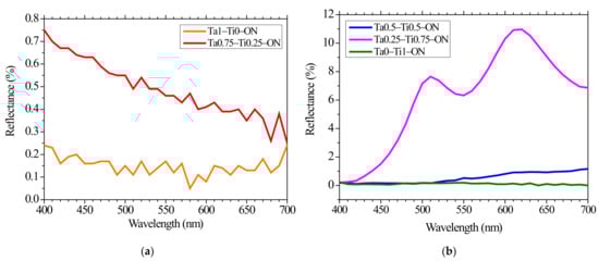 The variation of the reflectance as a function of the wavelength of the incident radiation: (a) Ta1–Ti0–ON and Ta0.75–Ti0.25–ON; (b) Ta0.50–Ti0.50–ON, Ta0.25–Ti0.75–ON and Ta0–Ti1–ON.