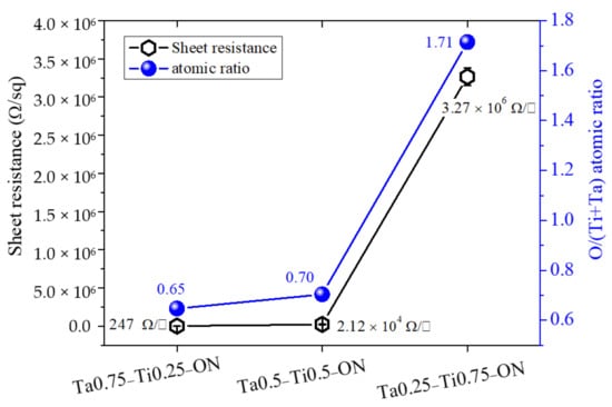 The values of the sheet resistance and of the O/metal ratio of the films produced in co-sputtering mode are depicted in Figure 13. As expected, a significant increase of the resistivity is observed when the O content of the samples increases. It would be difficult to find a better correlation between the sheet resistance and the atomic ratio O/(Ta + Ti) as the one expressed in the figure.