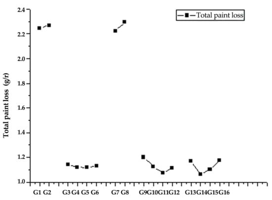 Table 9 shows the results of the paint film mass loss test, and Table 10 shows the range analysis results. The factor that has the most significant influence on the total paint film damage is the type of paint combination (Table 10). The least influential factor is whether to use the Didebao primer. Since the total paint film mass loss is more significant, the wear of the paint film is greater, and the thickness is worse. Therefore, the level corresponding to the minor paint film mass loss among the various factors is taken as the optimal level. Therefore, the optimal process parameter for increasing the paint film mass loss of the paint film is “brushing the Didebao primer—using 320# sandpaper to sand the surface—spraying PU sealing primer—spraying PU primer twice and NC topcoat once + 320# sandpaper for paint coating”. In order to analyze the influence of these factors on the paint film mass loss and find out the law, OriginPro 8.0 (2014, Originlab, Northampton, MA, USA) software was used to graphically process the total paint film mass loss value corresponding to each level in Table 10. The results are shown in Figure 5.