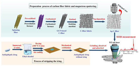 In this work, the commercial carbon fiber was applied as SERS template material. The spun fiber was firstly oxidized, then they were carbonized to obtain the C-fibers. However, these sporadic C-fibers were fragile and hard to apply to the preparation of SERS substrate. Therefore, a knitting machine was used to spin C-fibers into C-fiber fabrics. The surface of C-fiber fabrics was then decorated with Ag nanoislands by magnetron sputtering to construct Ag-C-fiber nanostructures. The morphology of Ag-C-fiber nanostructures could be tuned through systematic variation of experimental parameters. In addition, the high absorptivity of C-fiber fabric will bring analyte enrichment effect in SERS measurement. The schematic diagram of the Ag-C-fiber preparation process is exhibited in Figure 1. Importantly, the Ag25-C-fiber (the sputtering time was 25 min) exhibited excellent SERS performance with EEF higher than 3.871 × 106 and the LOD for crystal violet CV was as low as 1 × 10−13 M. Moreover, the antiepileptic drugs (levetiracetam and sodium valproate) were investigated by Ag25-C-fiber SERS substrate. Overall, it is anticipated that the developed Ag25-C-fiber SERS substrate could become an ideal SERS platform candidate in SERS-based biomedical sensing applications.