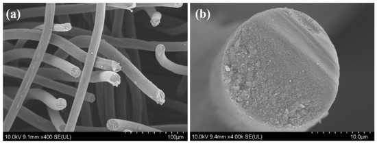 FE-SEM images of (a) the prepared C-fiber fabric and (b) the cross-section of C-fiber.