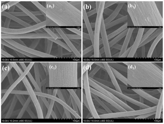 FE-SEM images of Agx-C-fiber substrates prepared with different sputtering time: (a) Ag15-C-fiber substrate; (b) Ag20-C-fiber substrate; (c) Ag25-C-fiber substrate and (d) Ag30-C-fiber substrate. (a1–d1) The corresponding amplifying FE-SEM images of (a–d).