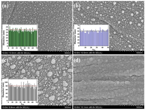 Amplifying FE-SEM images of Agx-C-fiber substrates prepared with different sputtering times: (a) Ag15-C-fiber substrate; (b) Ag20-C-fiber substrate; (c) Ag25-C-fiber substrate and (d) Ag30-C-fiber substrate. The illustrations were the histograms of size distribution in the corresponding FE-SEM images.