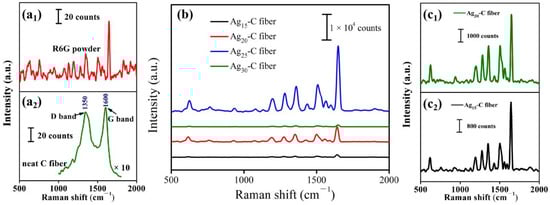 (a1,a2) Raman spectra of R6G powder and neat C fiber; (b) Raman spectra of 10−6 M R6G on different Agx-C-fiber substrates; (c1,c2) the Raman spectra of 10−6 M R6G on Ag30-C-fiber and Ag15-C-fiber substrates consistent with Figure 6b.