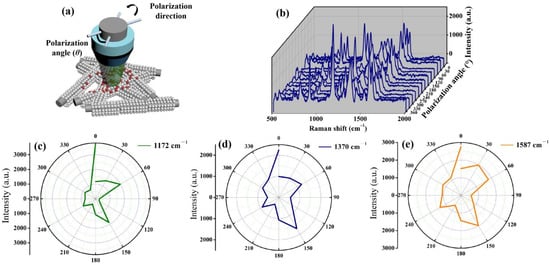(a) The principle diagram of polarization measurement of Ag25-C-fiber SERS substrate; (b) SERS spectra of CV at different polarization angles on the Ag25-C-fiber substrate; (c–e) polar curves of the Raman intensities at 1172, 1370 and 1587 cm−1 characteristic peaks.