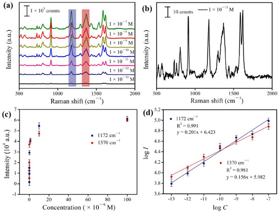 (a) Raman spectra of CV solution with different concentrations on Ag25-C-fiber substrate; (b) Raman spectra of 10−13 M CV absorbed on Ag25-C-fiber substrate; (c) Raman signal intensities at main peaks of CV at different concentrations; (d) linear calibration plots between the Raman signal intensity and CV concentration.