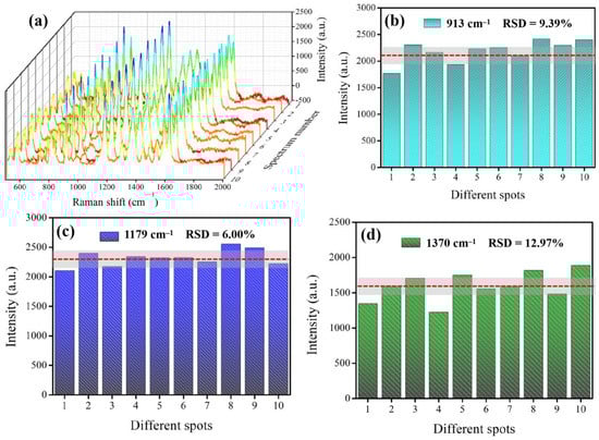 (a) Raman spectra of 10−10 M CV solution collected from 10 randomly selected substrates; (b–d) the Raman signal histograms at the characteristic peaks of 913, 1179 and 1370 cm−1 and the corresponding RSD values.