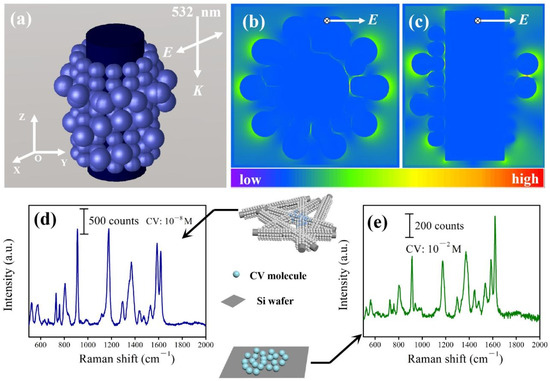 (a) 3D-FDTD model of Ag25-C-fiber substrate; (b,c) spatial distributions of electromagnetic field intensity of Ag25-C-fiber model in x-y plane and x-z plane; (d) Raman spectrum of 10−8 M CV solution on Ag25-C-fiber substrate; (e) Raman spectrum of 10−2 M CV solution on Si wafer.