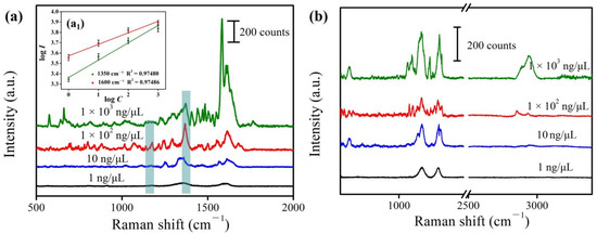 Therefore, in order for ultra-sensitive detection of sodium valproate and further revealing the practicality of the Ag25-C-fiber substrate, a low-cost spectral detection method based on Ag25-C-fiber SERS substrate was carried out. Figure 11a shows the Raman spectra of sodium valproate with different concentrations ranged from 1 to 103 ng/μL, the characteristic peaks centered at 1350 cm−1 and 1600 cm−1 can be clearly observed. The LOD for sodium valproate was 1 ng/μL which was far lower than that detected by reversed-phase HPLC method [48]. Meanwhile, under logarithmic operation, the linear modified relationship curves of Raman signal intensity to sodium valproate concentration at 1350 cm−1 and 1600 cm−1 are displayed in Figure 11a1, which provides a reference for the detection of sodium valproate solution with unknown concentration. On the other hand, these two characteristic peaks which belong to C-fiber can be considered as good candidates for label-free and nondestructive identification of the unknown molecules, concurrently contributing to improving the sensitivity of Ag25-C-fiber substrate.