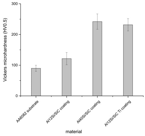 Figure 3 shows the average microhardness. All of the coatings present higher microhardness than the uncoated AA6082 aluminum alloy. This increment was higher than ×1.35 for the Al12Si/SiC coating, ×2.7 for the Al40Si/SiC coating, and ×2.5 for Al12Si20Ti/SiC coating.