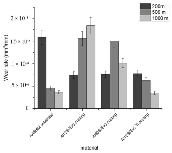The wear rates for the substrate and coatings on AA6082 aluminum alloy are shown in Figure 5. In addition, the wear distance influence was analyzed.