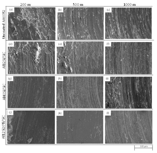 SEM micrographs of the worn surfaces of the uncoated AA6082 and the different coatings (Al12Si/SiC, Al40Si/SiC, and Al12Si20Ti/SiC) with the sliding distances (200 m, 500 m, and 1000 m); (a) uncoated AA6082 worn surface (200 m); (b) uncoated AA6082 worn surface (500 m); (c) uncoated AA6082 worn surface (1000 m); (d) Al12Si/SiC coating worn surface (200 m); (e) Al12Si/SiC coating worn surface (500 m); (f) Al12Si/SiC coating worn surface (1000 m); (g) Al40Si/SiC coating worn surface (200 m); (h) Al40Si/SiC coating worn surface (500 m); (i) Al40Si/SiC coating worn surface (1000 m); (j) Al12Si20Ti/SiC coating worn surface (200 m); (k) Al12Si20Ti/SiC coating worn surface (500 m); and (l) Al12Si20Ti/SiC coating worn surface (1000 m).