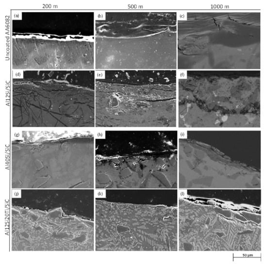 SEM micrographs of the cross-section of the wear surface of the uncoated AA6082 and the different coatings (Al12Si/SiC, Al40Si/SiC, and Al12Si20Ti/SiC) compared to the sliding distances (200 m, 500 m, and 1000 m); (a) uncoated AA6082 worn surface (200 m); (b) uncoated AA6082 worn surface (500 m); (c) uncoated AA6082 worn surface (1000 m); (d) Al12Si/SiC coating worn surface (200 m); (e) Al12Si/SiC coating worn surface (500 m); (f) Al12Si/SiC coating worn surface (1000 m); (g) Al40Si/SiC coating worn surface (200 m); (h) Al40Si/SiC coating worn surface (500 m); (i) Al40Si/SiC coating worn surface (1000 m); (j) Al12Si20Ti/SiC coating worn surface (200 m); (k) Al12Si20Ti/SiC coating worn surface (500 m); and (l) Al12Si20Ti/SiC coating worn surface (1000 m).