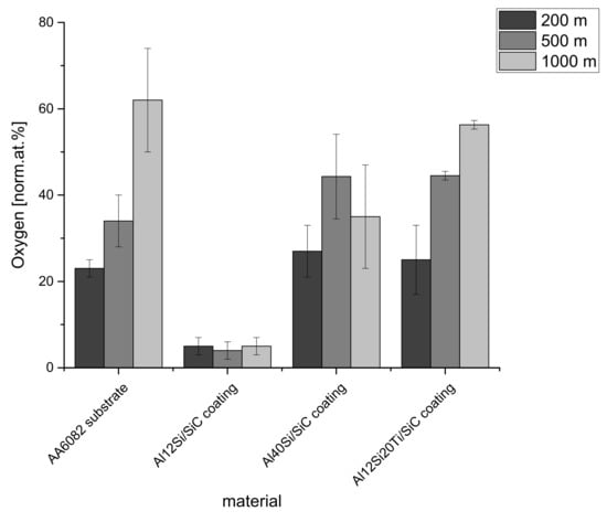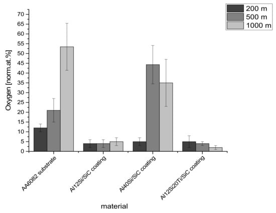 Oxygen percentage [norm. at.%] present on the worn surface of the uncoated AA6082 and the different coatings (Al12Si/SiC, Al40Si/SiC, and Al12Si20Ti/SiC) compared to the sliding distances (200, 500, and 1000 m).