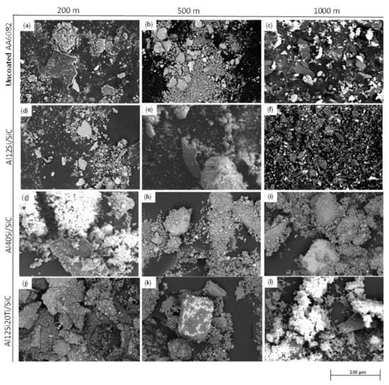 SEM micrographs of the debris obtained in the wear tests of the uncoated AA6082 and the different coatings (Al12Si/SiC, Al40Si/SiC, and Al12Si20Ti/SiC) compared to the sliding distances (200 m, 500 m, and 1000 m); (a) uncoated AA6082 debris (200 m); (b) uncoated AA6082 debris (500 m); (c) uncoated AA6082 debris (1000 m); (d) Al12Si/SiC debris (200 m); (e) Al12Si/SiC debris (500 m); (f) Al12Si/SiC debris (1000 m); (g) Al40Si/SiC debris (200 m); (h) Al40Si/SiC debris (500 m); (i) Al40Si/SiC debris (1000 m); (j) Al12Si20Ti/SiC debris (200 m); (k) Al12Si20Ti/SiC debris (500 m); and (l) Al12Si20Ti/SiC debris (1000 m).