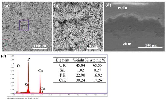 Figure 2a displays the morphology of the conversion of the Ca-P-Sr-coated sample. Under low magnification, it can be seen that a strip-like coating covered the surface of the pure zinc. The higher magnification in Figure 2b demonstrated that the coating morphology was composed of rock-like crystals, which were decorated with lots of holes. The rock-like crystals were stacked on top of each other. Actually, once pure zinc was soaked with the electrolyte, heterogeneous nucleation of crystals began to form on the substrate, which then gradually translated into an inner dense layer. As a process, the crystals are then deposited on the inner layer stack-by-stack. In this case, there are a lot of cracks and pores in the crystal layer []. The corresponding EDS results in Figure 2c suggested that the main elements of the coating were Ca, P, Sr, and O. The cross-section image of the coated zinc is shown in Figure 2d. The compact and dense coating was well-combined to the matrix with no observable defects, such as cracks and pores. Moreover, the thickness of the Ca-P-Sr was approximately 48 ± 4 μm.
