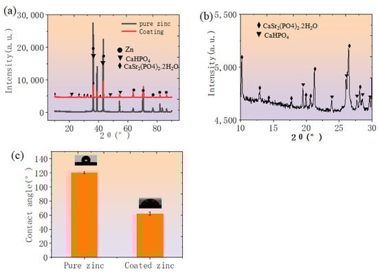 The XRD patterns of pure zinc and the Ca-P-Sr-coated zinc are presented in Figure 3a. The strongest intensity of the peaks from both samples was assigned to the zinc, while the peaks at 38.2°, 46.0°, and 55.1° from coating belonged to CaHPO4, indicating that the main phase of the coating was CaHPO4. Moreover, local XRD patterns ranged from 10 to 30 degrees of coated zinc, obtained from Figure 3a, suggesting that CaSr2(PO4).2H2O was detected in the coating (Figure 3b). The surface wettability of the pure zinc and coated zinc is displayed in Figure 3c. As a rule, surface wettability is greatly associated with the bioactivity of biomaterials, and surface hydrophilicity can favor the attachment and proliferation of cells. The result of the surface wettability suggested that the coating significantly reduced the contact angles of pure zinc, indicating that the surface hydrophilicity was improved after the fabrication of the Ca-P-Sr coating.