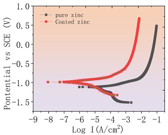 Table 1. Generally, in the polarization curve, the cathodic branch is dominated by hydrogen evolution, and metal dissolution is related to the anodic branch. As can be seen from Figure 4, the current densities of the cathodic and anodic branches in the coated sample were reduced concerning pure zinc, suggesting that the corrosion resistance of pure zinc was elevated. Moreover, the corrosion potential of the coated zinc shifted to a more positive potential than the pure zinc, which indicated that the corrosion thermodynamic tendency was reduced by the presence of the coating. As shown in