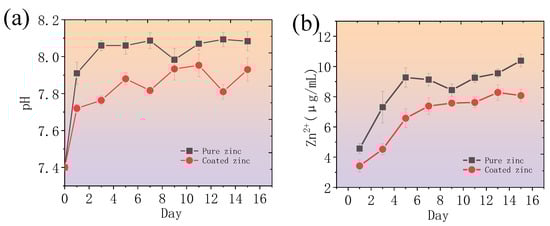 To further determine the degradation behavior of the coated zinc, the immersion tests in terms of pH and Zn ion release were conducted in SBF solution at 37 °C, as shown in Figure 5. The pH curves of the pure zinc and coated zinc after samples were immersed in SBF for 15 days are displayed in Figure 5a. The pH value of the pure zinc rapidly increased on the first day, and reached the highest value on the third day. Then, the pH value gradually reduced with time. This is due to the deposition of the corrosion product on the zinc substrate. However, the pH curves showed a fluctuating profile, which was caused by an alternative in pit corrosion, generation, and degradation of corrosion products. On the contrary, the Ca-P-Sr coating greatly reduced the pH value during the immersion time, and the pH value remained relatively stable. The pH values for pure zinc and Ca-P-Sr-coated zinc were about 8.14 and 7.92 after a 15-day immersion. It has to be noted that the pH values dropped slightly at 7 and 13 days. The explanation may be that there was an alternative in degradation of the coating and generation of corrosion products on coatings. When the coating was exposed to the solution, the degradation of the coating occurred, and then the solution infiltrated into the substrate. Meanwhile, the corrosion products were also deposited on the coatings, which may contribute to protecting the substrate. Figure 5b shows the amount of Zn ions dissolved from pure zinc and Ca-P-Sr-coated zinc. Similar to the pH value, the concentration of Zn ions released from the coated zinc was significantly suppressed, suggesting that the Ca-P-Sr coating could improve corrosion resistance. The above results indicated that the coating on pure zinc could limit the release of OH− and zinc ions.