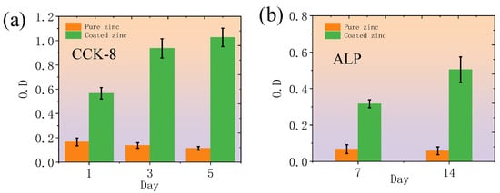 Figure 6a presents the cell activity of pure zinc and coated zinc exposed to MC3T3-E1 for 1, 3, and 5 days. It can be seen that there was almost no cell activity in the pure zinc group. This indicated that the cell proliferation may be inhibited by the accumulated zinc ions and pH value. However, this issue was improved by the coating, whereby the cell activity of coated zinc gradually increased with time, suggesting that the cytocompatibility of pure zinc was significantly improved. Moreover, the cell activity was also evaluated by ALP. The ALP expression levels of the cells in the samples studied for 14 days were shown in Figure 6b. As it is known, ALP, a specific marker of osteoblast differentiation, is one of the most common indicators of evaluating the secretion function of osteoblasts, which is closely related to the ability of osteoblast differentiation. The continued expression of ALP is an important marker for detecting bone mineralization and osteogenesis via favoring hydrolysis of multiple phosphates under alkaline conditions. Similar to the results of cell activity, the ALP expression on the pure zinc was inhibited during the culture time, mainly resulting from the cytotoxicity induced by the high zinc ion concentration. In this study, the expression of ALP in the coated samples was significantly improved concerning the bare zinc, showing that the ALP activity of cells grown on the coating had a significant enhancement.
