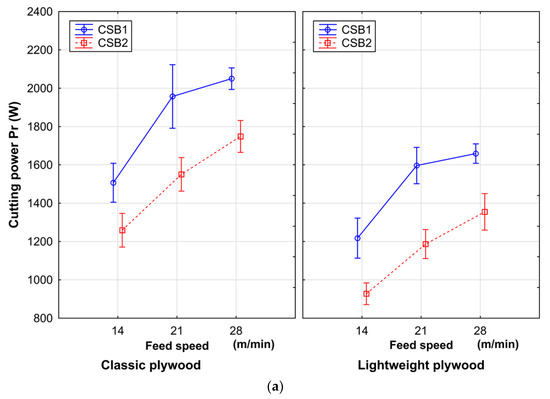 Cutting power depending on feed speed and type of circular saw blade (CSB) in sawing classic and lightweight plywood: (a) rotation speed = 4050 min−1; (b) rotation speed = 4150 min−1.