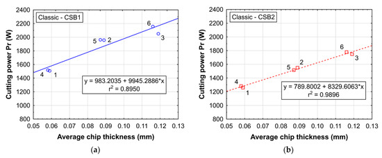 Average chip thickness, as a critical factor in the sawing process, significantly affects the cutting power. An increase in the cutting power in average chip thickness in the case of both examined cut materials (classic and lightweight plywood) is shown in Figure 8. The dependence is mentioned in other scientific work [3,13]. Figure 8 shows that the highest coefficient of determination obtained between the cutting power and the average chip thickness was achieved in the case of classic plywood using a CSB2 circular saw blade (r2 = 99%). A very high tightness is ensured by the value (80% ≤ r2) [47]. A lower coefficient of determination between the cutting power and the average chip thickness was achieved in the case of lightweight plywood compared to classic plywood using a circular saw blade CSB1 (r2 = 82% and 90%). Equation (1) shows that in the case of both materials, an increase in the feed speed corresponds to an increase in the chip thickness, which results in higher cutting power.