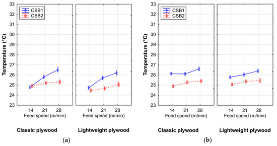 Figure 9 shows the dependence of the surface temperature of the circular saw blades on the feed speed at the rotation speed n = 4050 min−1. As we can see from Figure 9, the surface temperatures of the circular saw blades CSB1 and CSB2 had values at about 24.5 ± 0.2 °C at the sensor position of 65 mm from the shaft axis (near the flanges). These temperatures increased slightly with increasing feed speed to the values of 25 to 26.5 °C.