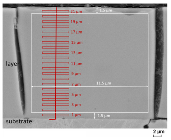 The alloy composition of the Fe-Cr-Ni layers was determined in cross-section. The elements were determined using an EDAX GENESIS energy-dispersive X-ray spectroscopy (EDXS) spectrometer at a LEO1455VP (Zeiss, Oberkochen, Germany) scanning electron microscope with an integration time per element analysis of two minutes (accelerating voltage: 25 kV). The elements were determined by area and point analyses, as shown in Figure 1. For point like analyses, small fields of a size of 0.4 µm height and 5.5 µm width were set as a function of the depth below the surface. In addition, scanning electron microscopy (SEM) images were taken to investigate microcracks in the layers.