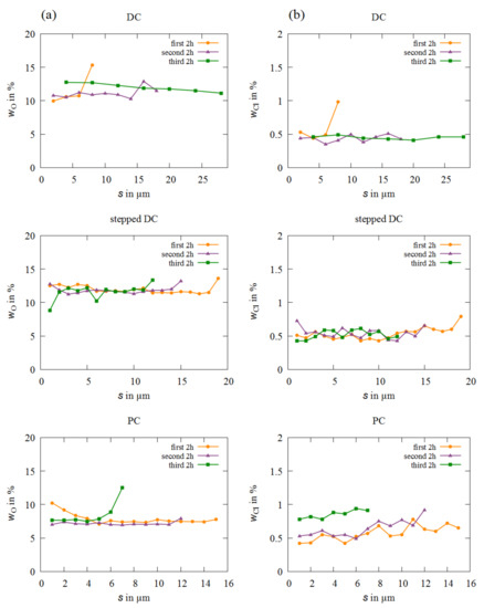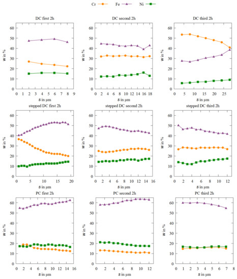 The data in Figure 3 confirm that the alloy composition over the entire coating thickness for the DC samples for the first and second deposition are nearly constant, but at the third deposition the alloy composition deviates strongly. In the third DC deposition in a row, the chromium content is significantly larger and the iron content significantly smaller compared to the first and second deposition. In addition, the local distribution of the chemical elements varies strongly: Cr starts at wCr = 55% at the substrate and decreases over the layer thickness to wCr = 40%, while at the same time the iron content increases from 29% to 39%. This strongly suggests that after 4 h coating time with DC, the equilibrium ratios of the metal ion complexes in the electrolyte begin to change. When using stepped DC, it behaves the opposite way. There, the electrolyte needs a run-in time to establish an equilibrium, which ensures a constant alloy composition of about wFe = 45%, wCr = 25%–30% and wNi = 15%. Compared to the study by Adelkhani et al. which indicated a chromium content of 5%–15%, the contents measured here are up to 35% higher. [10]. Only the chromium content of the Fe-Cr-Ni samples produced under PC conditions corresponds to these values. Other studies have also achieved a similar alloy composition like Adelkhani et al. [8,17]. Apparently, the use of pulse current favors the deposition of iron, while the deposition of chromium is disadvantaged. The fraction of nickel in the alloys is about the same as in the other layers. Overall, both the current mode and the consumption of the electrolyte within 6 h do not seem to have any strong effect on the nickel content in the alloy.