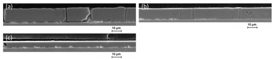 Scanning electron microscopy micrographs of cross-sections of electrodeposited Fe-Cr-Ni coatings under PC conditions for three depositions (a) after first 2 h of electrolyte use with clear microcracks, (b) after second 2 h with some thin microcracks, and (c) after third 2 h with only a small layer thickness but without any microcracks.