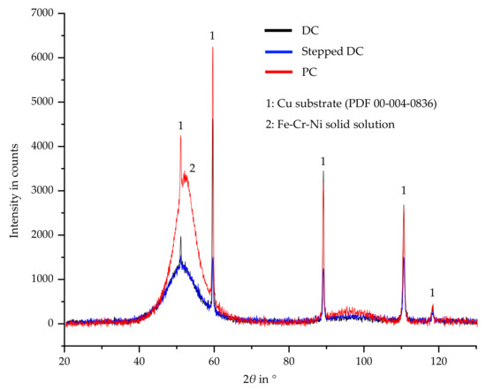 For the diffraction diagrams of the Fe-Cr-Ni films shown in Figure 7, as expected, a nanocrystalline structure can be observed for all of them. The narrow peaks (numbered 1) are caused by the copper substrate. It is noticeable that the layers applied under DC and stepped DC can hardly be distinguished from each other. Thus, the crack-free and crack-poor layers cannot be attributed to a change in crystal structure. In comparison, a pronounced peak can be seen in the PC sample. This indicates that crystal growth is starting to occur here. Although PC plating generally leads to grain refinement, it seems to promote crystal growth in nanocrystalline structures. It is possible that the observed lower deposition rate leads to crystal growth due to a change in the electrolyte equilibrium ratio under PC. According to the inverse Hall-Petch-relationship, microstructures with larger crystallites are not as susceptible to high residual stresses as nanocrystalline materials, which, in turn, has a positive effect on the crack reduction and results in uniform layer [21].