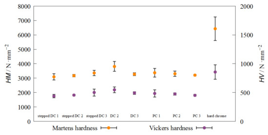 Figure 8 shows the Martens hardness values of the Fe-Cr-Ni layers depending on the coating method and in comparison to hard chrome. By comparing the layers with one another, it is noticeable that all coating methods are almost on the same hardness level. The results of the Vickers hardness measurements are in agreement with previous studies of electrodeposited Fe-Cr-Ni alloys [9,22]. Hydrogen embrittlement of galvanically applied layers leads to internal stresses and thus to crack formation without an increase in mechanical strength. In this regard, it should be noted that the average chromium content of the PC samples, which have approx. wCr = 10% chromium content, do not exhibit any loss of hardness. PC deposition leads to a higher nucleation rate, which causes a higher hardness due to the Hall-Petch relationship. The Martens hardness of hard-chrome layers is about 6500 N mm2. Consequently, the applied layers achieve a hardness of 52% of hard chrome. The crystallite size of electroplated hard chrome is between 50 and 200 nm [23]. In the literature you can find a crystallite size of 20–25 nm for Fe-Cr-Ni layers [5]. An inverse Hall-Petch effect for nanocrystalline materials has been observed by a large number of researchers. For example, the critical grain size of nickel was determined at about 20 nm [24]. Below this grain size, an inverse Hall-Petch effect was observed. All crystallite sizes of the layers studied here are below 2 nm. Therefore, it can be assumed that this inverse Hall-Petch effect is present in Fe-Cr-Ni films. From the XRD analyses, it can be seen that slightly larger crystallites are formed by PC deposition. On these samples, the inverse Hall-Petch effect probably will not be quite as pronounced, so that the low chromium content can be compensated. At the same time, the inverse Hall-Petch effect is also responsible for the significantly lower hardness of the Fe-Cr-Ni deposits compared to the hard-chrome coating. The first sample, which was deposited under DC, was too fissured due to its brittleness to be able to measure its hardness.