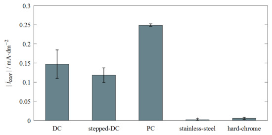 Figure 9 shows the extracted corrosion current densities directly of the Fe-Cr-Ni layers compared to hard-chrome coatings and stainless steel (bulk). The corrosion current densities of the Fe-Cr-Ni layers deposited by stepped DC show the lowest values of all Fe-Cr-Ni layers. The PC deposited coatings performed the worst. A reason for that behavior could be the lower chromium content of these samples (wCr = 10%). The stepped-DC samples exhibit only about half the corrosion current density of the PC coatings and are about 20% lower than that of the classically applied DC coatings. The microstructure may be responsible for this lower corrosion current density. Since the stepped-DC coatings have a significantly lower crack density, the effect of contact corrosion due to electrolyte contact with both the layer and the substrate is significantly lower here. However, the corrosion current density of the Fe-Cr-Ni coatings is between 21 and 44 times higher than that of pure hard-chromium coatings. The microcracks allows oxygen to penetrate the substrate where it reacts with the copper, increasing the corrosion current density. Akram et al. [25] specify for their High Velocity Oxy Fuel (HVOF)-sprayed chromite coatings a corrosion current density in 3.5% NaCl solution of 5.59 × 10−6 A/cm2. Thus, the corrosion current densities of the electrodeposited Fe-Cr-Ni coatings (between 1.18 × 10−6 and 2.49 × 10−6 A/cm2) studied here are in this order of magnitude and may even exhibit a slightly better corrosion rate.