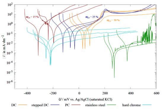 Figure 10 shows the current density as a function of the applied potential of different deposition methods. The polarization curves obtained are reasonably reproducible. It is noticeable that DC coatings and PC coatings have a negative corrosion potential, whereas that of pure DC coatings is positive. From this, a clear trend can be observed that there is a positive shift in the corrosion potentials with increasing chromium content in the Fe-Cr-Ni coatings. Compared to the stepped-DC and PC coatings, the DC coatings have a higher microcrack density and the individual cracks are more pronounced. As a result, more NaCl solution reaches the substrate material (copper) and an increased cathodic reaction takes place on the nobler copper, which shifts the corrosion current potential towards positive values. The difference in electrochemical behavior between the electrodeposited Fe-Cr-Ni samples and the AISI 304 stainless steel is attributed to the dissimilarities in the microstructure and chemical composition of the passive oxide film [26]. As previously shown in the study on the influence of heat treatment on the microstructure of Fe-Cr-Ni coatings, electrodeposited Fe-Cr-Ni alloys are amorphous or nanocrystalline in contrast to its metallurgical crystalline counterpart [11]. In addition, the incorporation of oxides, chlorides, hydroxides, and hydrides by electrolyte additives into the coating leads to enhanced hydrogen evolution reactions [19,27] and a passive oxide layer that differs in chemical composition from that of AISI stainless steels. The DC samples and the stepped-DC samples both exhibit a passivation peak at a potential of about 180 mV. The observations made here are consistent with those from the experiments in aqueous sulfuric acid by Bertero et al. [26]. In the 2018 study, very broad current peaks for electrodeposited Fe-Cr-Ni coatings with wCr = 12%–18% were recorded between −200 and 400 mV [26]. During the formation of chromium oxides on the precipitates, the previously dissolved Fe2+ and Fe3+ ions are stabilized [28]. It can also be observed that with a higher chromium content, the current peaks are a little flatter. Passive layers prevent the penetration of oxygen into the substrate material and thus reduce the overall corrosion. The current density-potential curves of the PC samples have no such peaks, indicating that no passivating oxide layer has formed in these samples. One reason for this could be the Cr content, which is below 12% and thus does not allow for the formation of a protective oxide layer. This could also explain the significantly higher corrosion current densities of these specimens. The influence of the nickel on the corrosion behavior can be neglected since the nickel content was approximately the same in all three coating types.